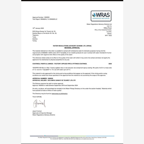 EKS KİMYA; ürettiği tüm boyaları zamanın sağlık, çevre ve dayanım şartlarına uygun olarak formüle etmektedir. Genel olarak içme suyu boru boyalarından istenilen özellikler; taşınacak suya, insan sağlığına zararlı oranlarda yabancı madde karıştırmaması, tat ve kokusuna etki etmemesi ve aşınma ile oluşacak korozyona dayanıklı olmasıdır. GEOTEC markalı ürünler alınmış olan yurt içi ve yurt dışı test raporlarıyla, bu beklentileri karşılamaktadır.
